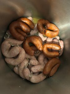Zurück im Clubhaus konnte das jährliche Stiftungsfest beginnen. Einige Mitglieder hatten bereits am Tag zuvor die Tische für die 33 Teilnehmer:innen aufgebaut und eingedeckt. Zu essen gab es Grünkohl satt (Bregenwurst, frisch und geräuchert, Kassler und Bauchfleisch samt Kartoffeln) sowie Lachslasagne.